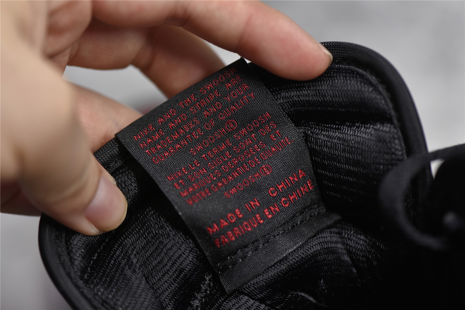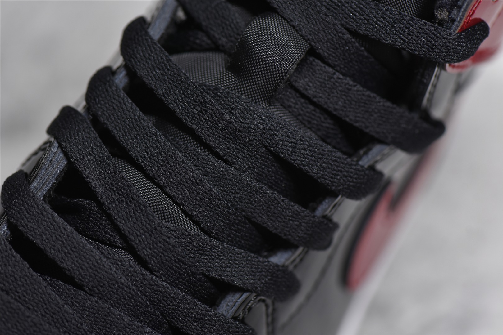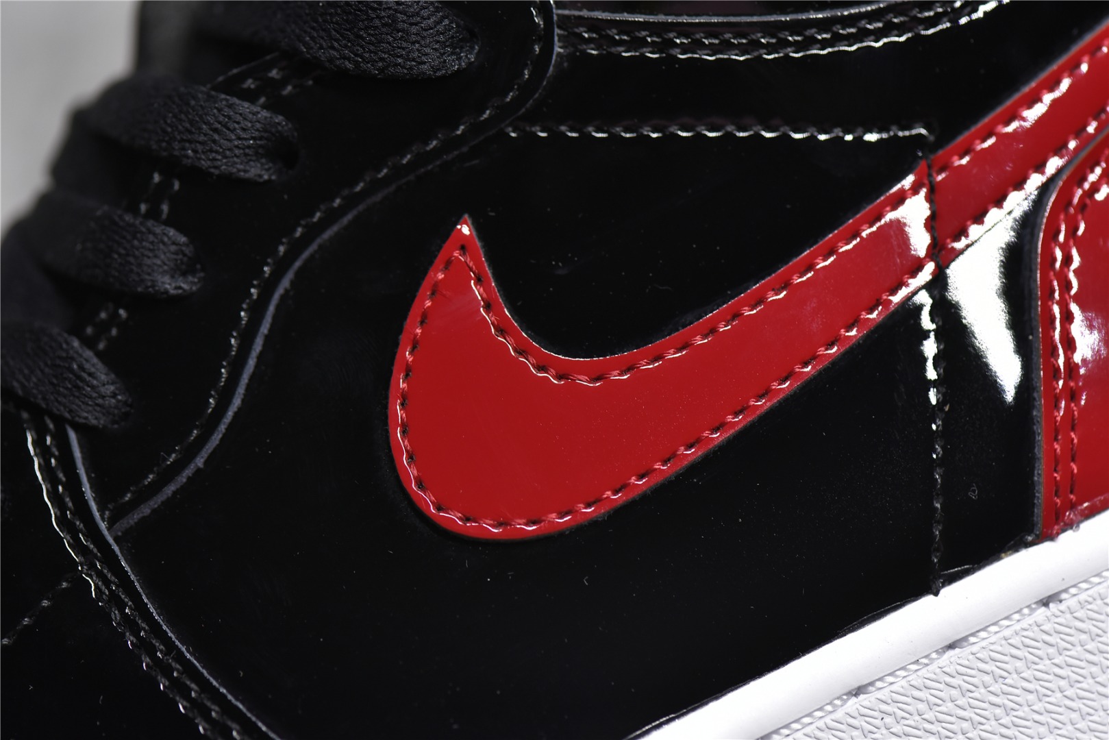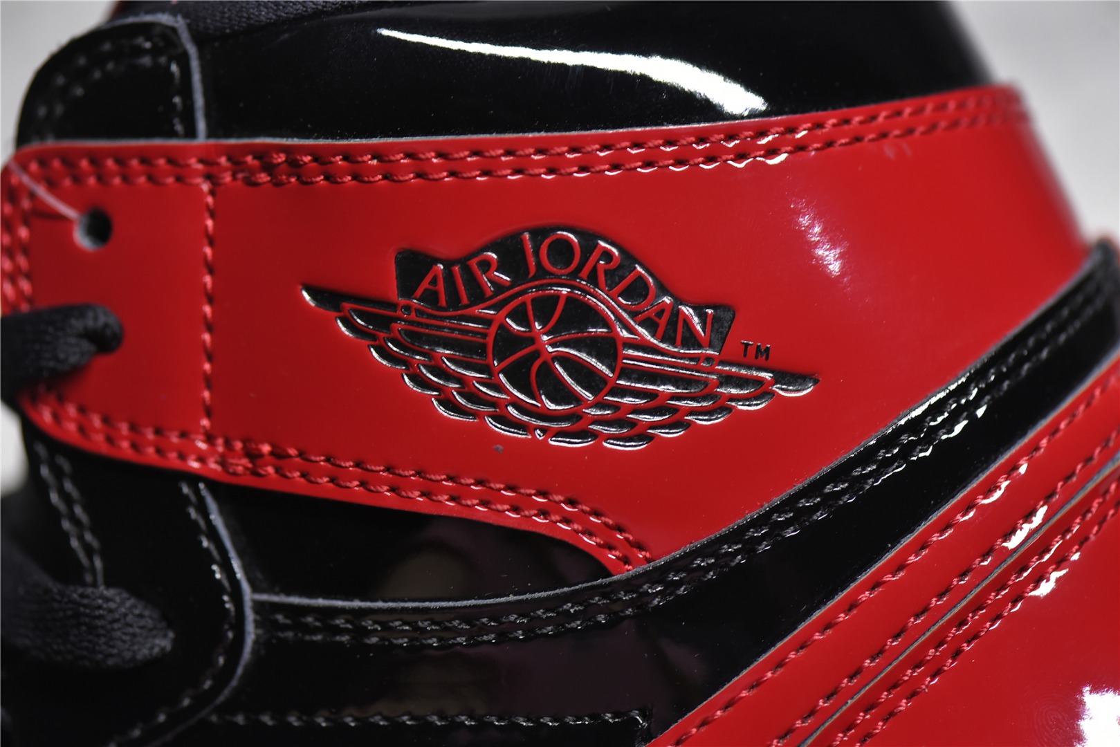 Detail appraisal Air Jordan 1 High OG "Bred Patent" patent leather black red gold man tag