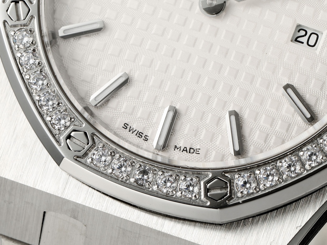 AUDEMARS PIGUET Royal Oak Series 67651OR Ladies' Quartz Watch ~ Shining debut! Goddess versatile style, sparkling and charming! The genuine product purchased through the APP is disassembled and mold-made. The entire process is CNC polished, and the pattern is checked and adjusted multiple times, with distinct edges and corners. The case diameter is 33MM. The multi-faceted bezel precisely fits the case. The bezel is fixed to the case with hexagonal screws (the bezel opening is set with exquisite Swarovski diamonds, dazzling and brilliant). The bracelet links are exquisitely and neatly arranged. The links have undergone hundreds of meticulous polishing processes, presenting a perfect texture. The folding clasp is easy to open and close and convenient to wear. The lugs of the watch are curved, which can ensure a better fit between the watch and the wrist. The dial is engraved with the "Grande Tapisserie" large checkered pattern decoration, paired with fluorescent three-dimensional hour markers and Royal oak hands. The wide hands and hour markers make reading the time simple and clear. The date display window at the three o 'clock position is shown in Arabic numerals. The wristwatch has a sealed case back, on which the English name of the Royal Oak series, "Royal Oak", is engraved. It is equipped with a Swiss F04111 quartz movement inside. Accurate timekeeping! APP production, making goddesses also very royal!