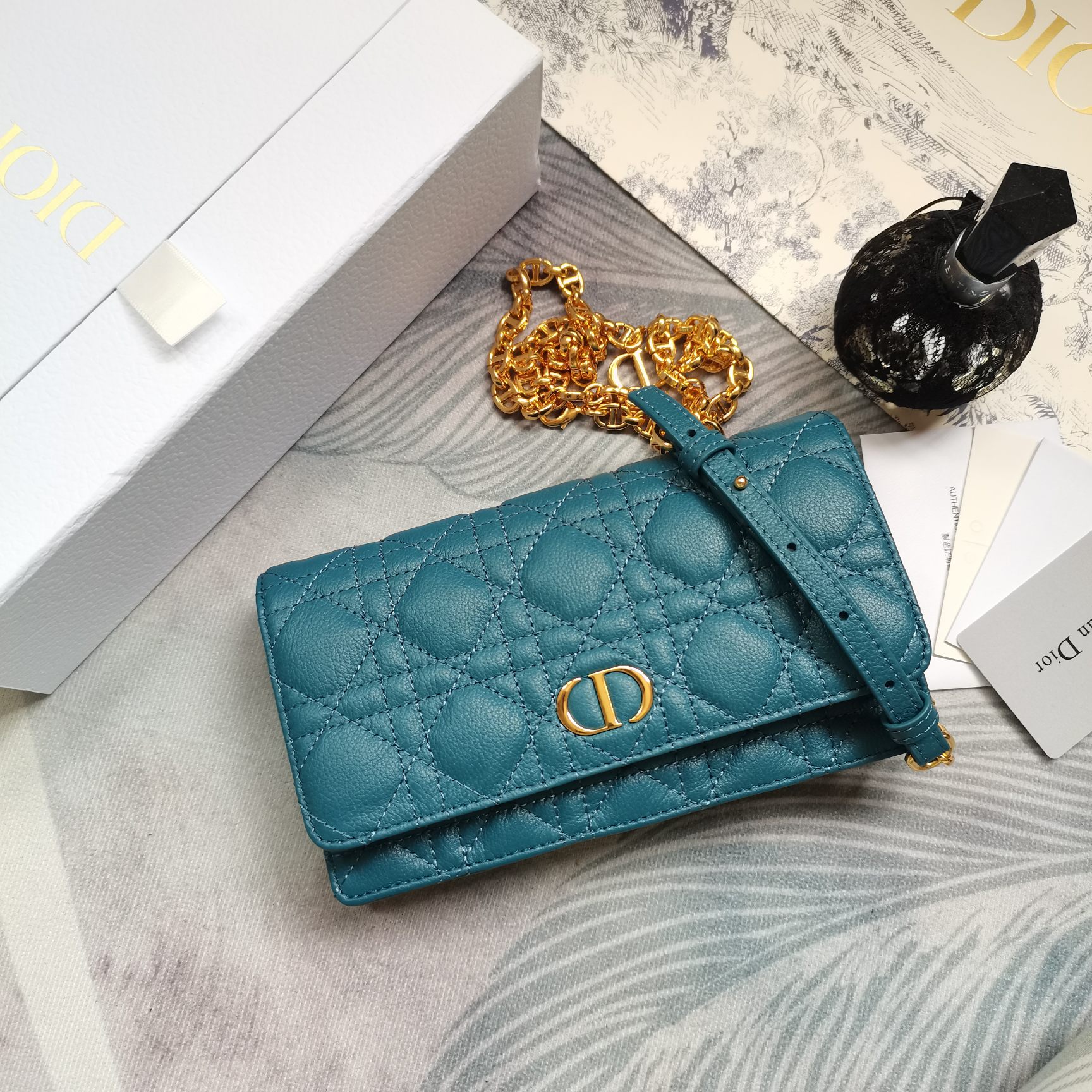 Original factory quality DIOR CARO Waist Bag 5091 Sea blue soft cowhide with rattan check pattern and chain This Dior Caro waist bag showcases an elegant and versatile style. Crafted from soft sea blue cowhide, it is adorned with rattan checkered stitching and features a "CD" logo flip cover. With an adjustable chain, it can be used as a waist bag, or carried over one shoulder or diagonally across the chest. The leather strap part is comfortable and adjustable, making it convenient to carry over the shoulder or as a shoulder bag. It is an ideal accessory for daily or evening wear. The front is decorated with the "CD" logo Flip cover opening and closing design One internal partition Two card slots The adjustable chain is decorated with the "CD" logo Adjustable leather strap Dimensions: 20 x 11.5 x 3.5 cm It can store an iPhone 12 Pro Max mobile phone