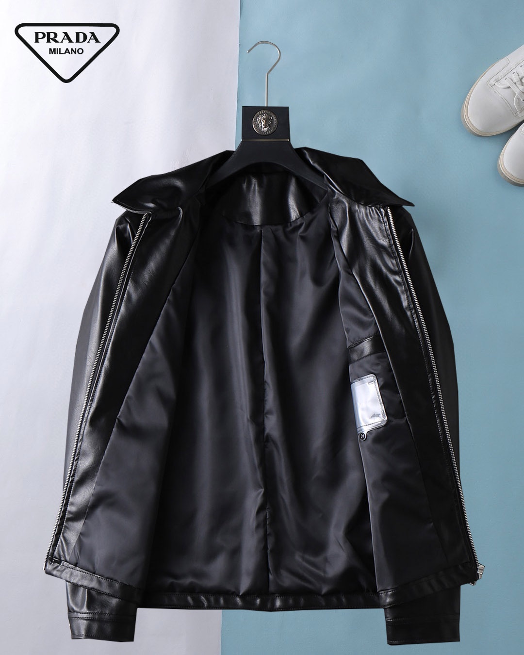 Prada (High-end Quality) Spring 2025 New Fashion Casual hooded leather jacket jacket, imported original technological fabric, comfortable and breathable when worn, exquisite handcrafted logo on the chest, unique European fashion style design, digital positioning printing process on the back, highlighting the personality of young people, original hardware accessories, extremely high grade, looking very cool when worn! Please report your height and weight when placing an order for M-3XL!