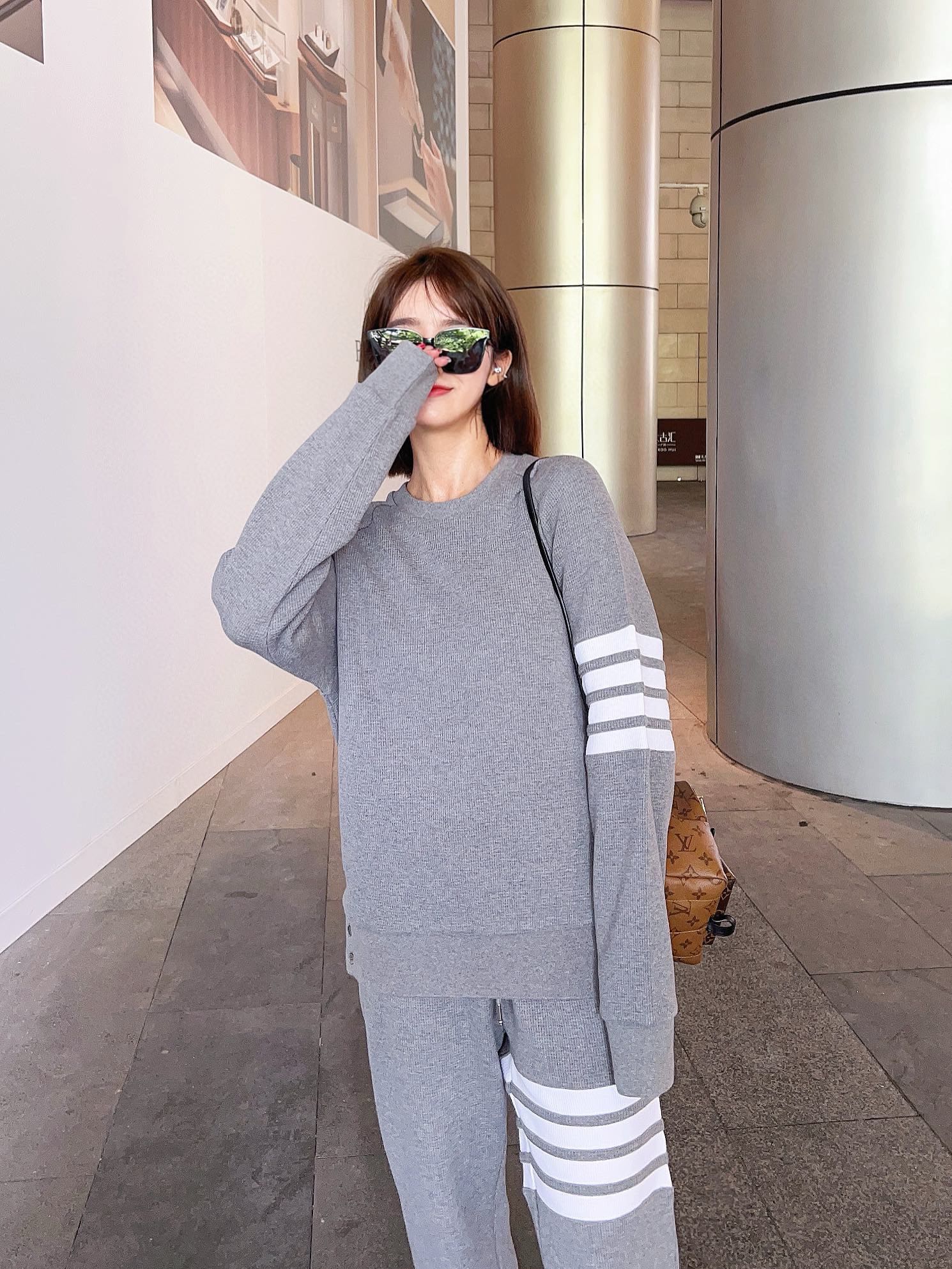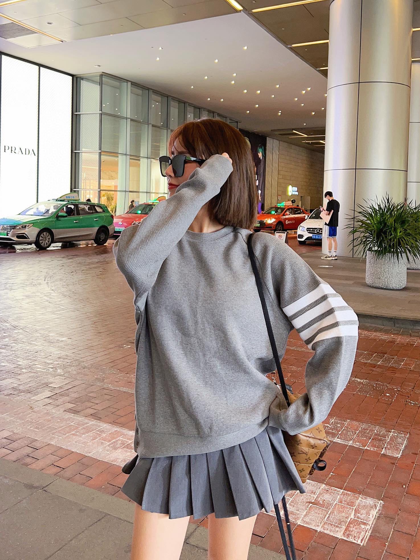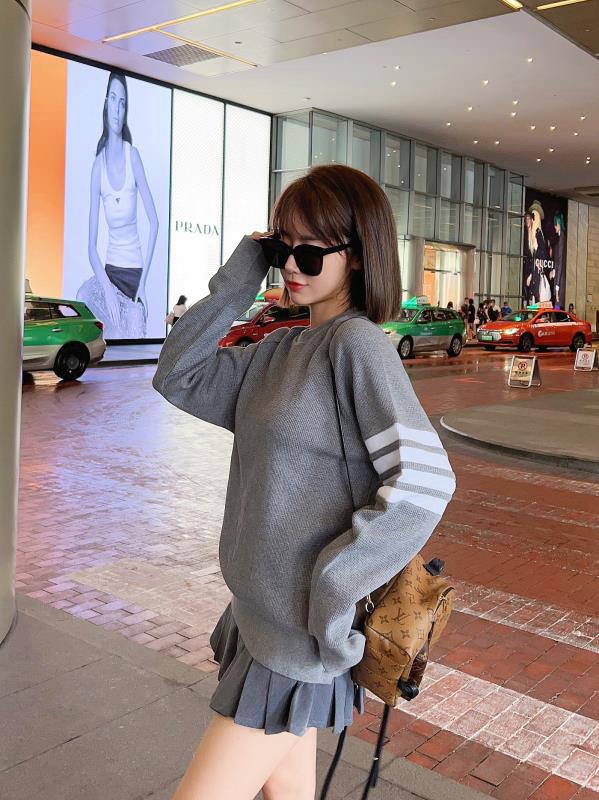 The effect of the model wearing it THOM BROWNE TB's new Waffle round-neck puller hoodie
