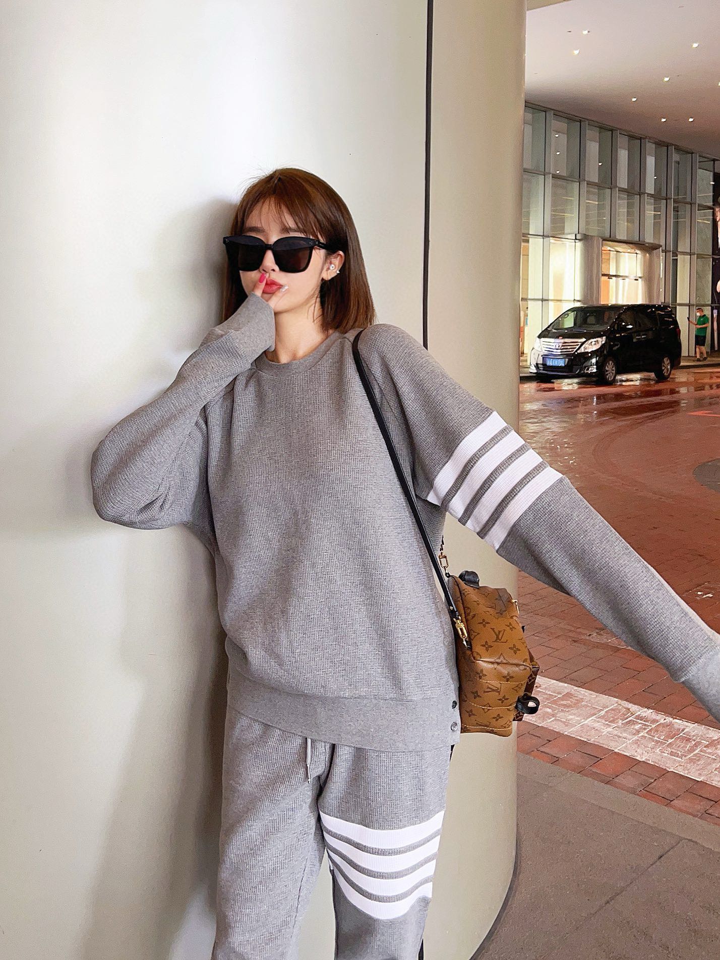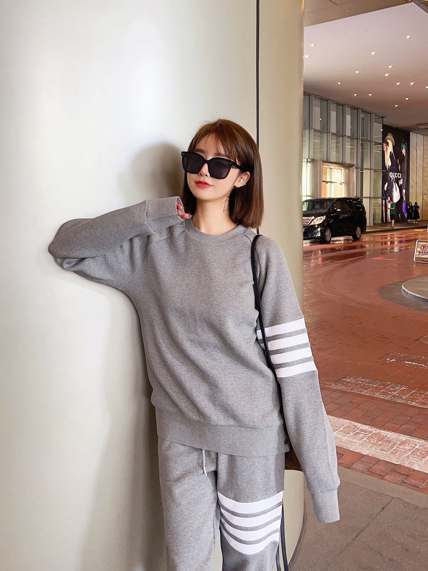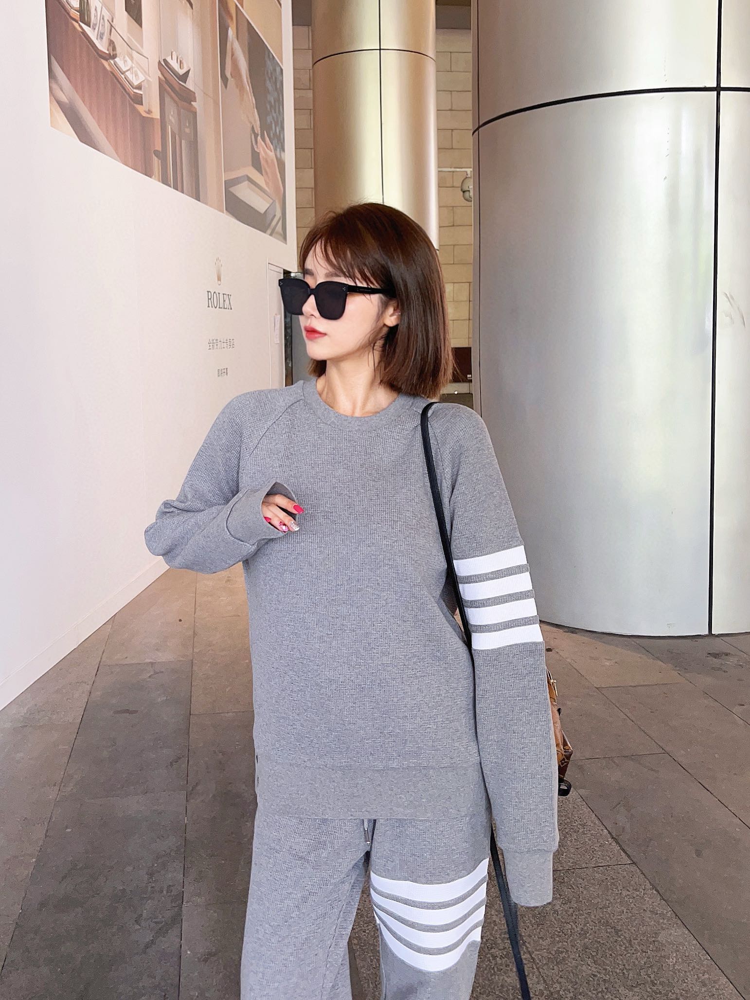 The effect of the model wearing it THOM BROWNE TB's new Waffle round-neck puller hoodie