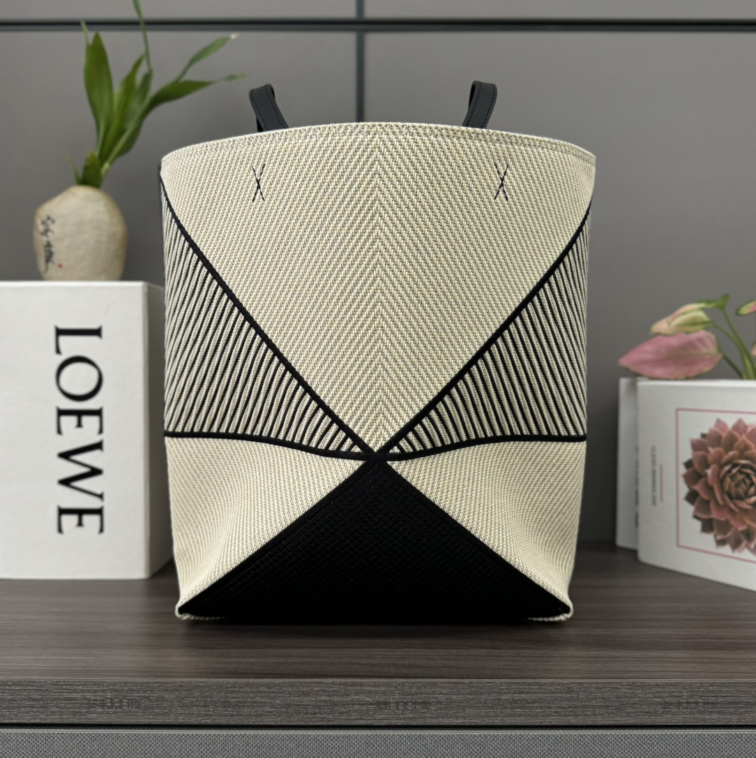 L??w? The new ?? Puzzle Fold handbag draws inspiration from the geometric lines of the brand's classic handbag collection and reinterprets the geometric architectural beauty of the inlaid pieces. It is ingeniously presented to be fully flat and foldable, making it a creative and lightweight handbag created by the travel brand. This version is made of cotton jacquard. Pair with cowhide handle ??? Shoulder or hand plant lining *L??w? embroidery Size: 25.5 * 14.5 * 31.5 CM Model: 052404