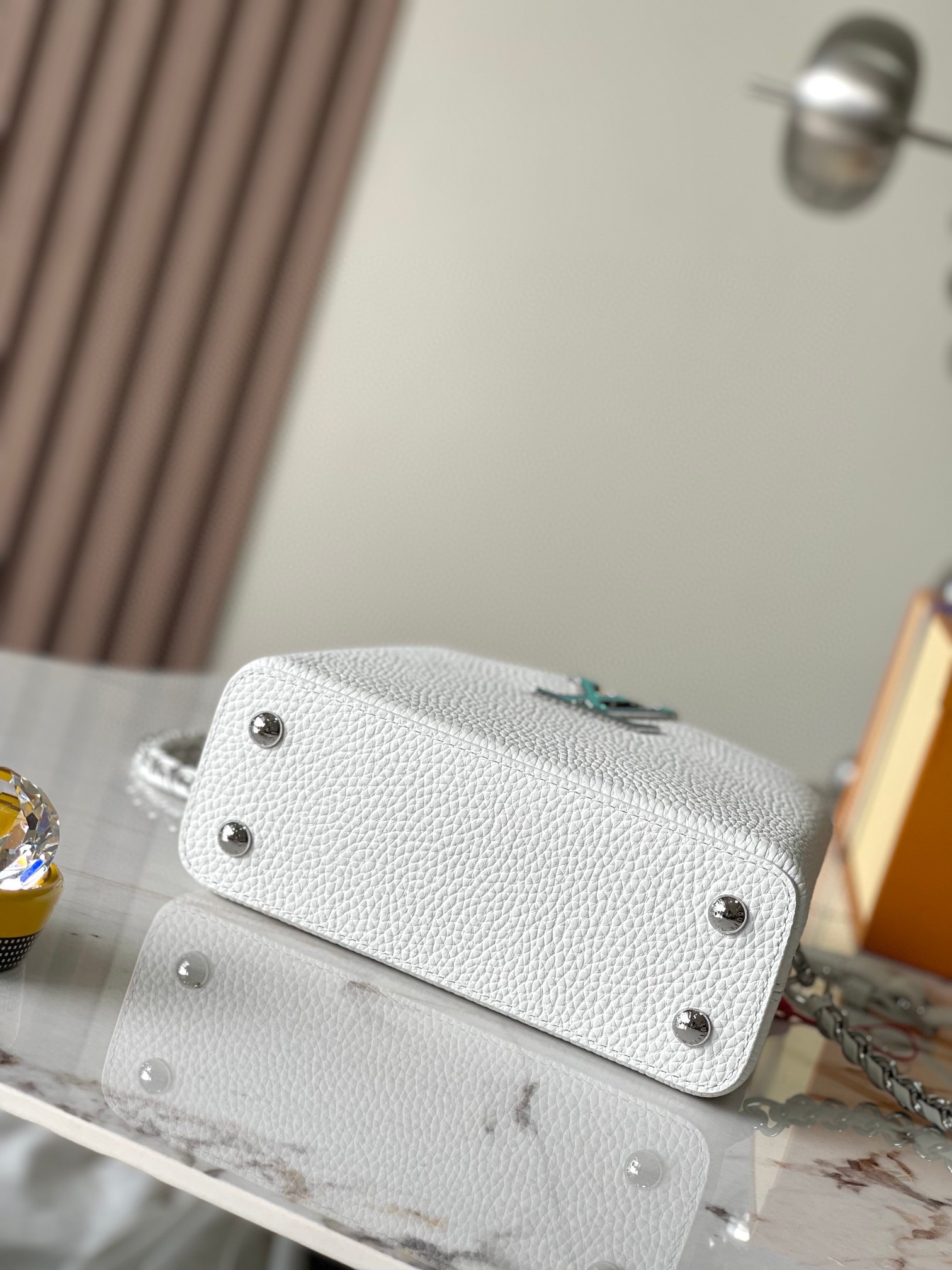 Variable code CHIP version [PREMIUM ORIGINAL FACTORY leather ?? M23082 pure white SHELL buckle] The full leather cap Na Ying series Qixi Festival limited Edition/Mini Capucines BB handbag is from the LV Milky Way series, presenting an exclusive gift for the Valentine's Day. The Taurillon leather is dyed in soft tones. The dazzling luster of the metal parts and the rainbow gradient create an elegant contrast. The detachable chain and leather shoulder strap make it convenient to carry over the shoulder or crossbody. 21