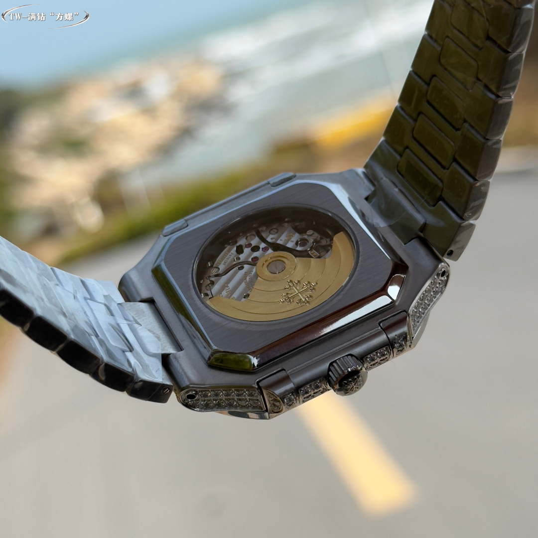 Patek Philippe Cubitus full diamond version ?? 5821 series... Patek Philippe's brand-new Cubitus series, with a size of 45 millimeters. In terms of numbers, the 45-millimeter size is larger than the 41-millimeter size of the Nautilus 5811G. However, judging from the comparison photos, the size difference between Cubitus 5821A and Nautilus 5811 is not that significant. This is because the 45mm of Cubitus is the size of the diagonal of the case (from the 10 o 'clock position to the 4 o 'clock position). The number is large, but the actual size is not that big. The brand-new Cubitus series from Patek Philippe features the 5821 three-hand movement, equipped with the Patek Philippe 330 automatic movement (modified from the 9015 Cal.330sc movement).