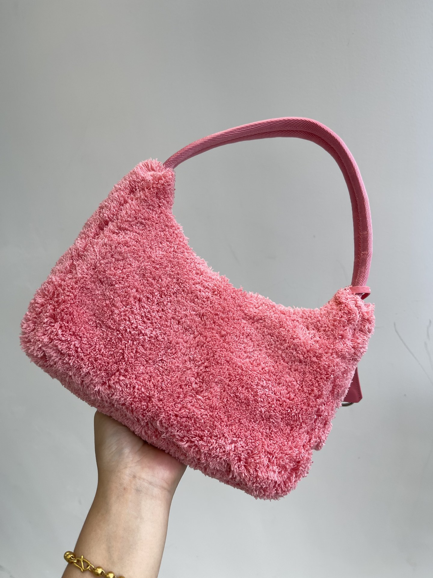 Prada 21s women's new 2000 wool loop fabric underarm single-shoulder bag. The bag body is made of soft loop fabric material. The touch is so good. It's fluffy and the soft and sticky texture is super comfortable. The brand's letter Logo is embroidered and engraved on the front, showcasing the brand's signature elements. The side is coated with an enamel metal triangular logo. The zipper opening and closing design features a Prada logo fabric lining inside. It has sufficient capacity and is lightweight and portable. The nylon webbing handle looks great when carried under the armpit or by hand. It's a great choice for commuting, going out, or even for daily dates and shopping. It's both fashionable and good-looking when going out. Recently, some of Prada's new models have perfectly interpreted the sweet and cool style, which is simply amazing. They are the new favorite of fashionista and another bestseller recommended by Internet celebrities. They are super versatile and good-looking. Fashionista must buy them. Size: 22X12X6cm nNumber: #63738950