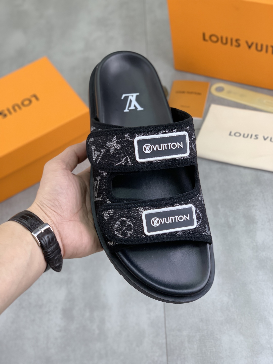 No. 2005???????? Top edition original single quality [LOUIS VUITTON] Official website bestseller Louis Vuitton LV men 's slippers on sale simultaneously! Italian imported original fabric, specially provided by the original factory. Original base size: 39-44 (38, 45, 46 customized). Multiple colors available. High-end packaging